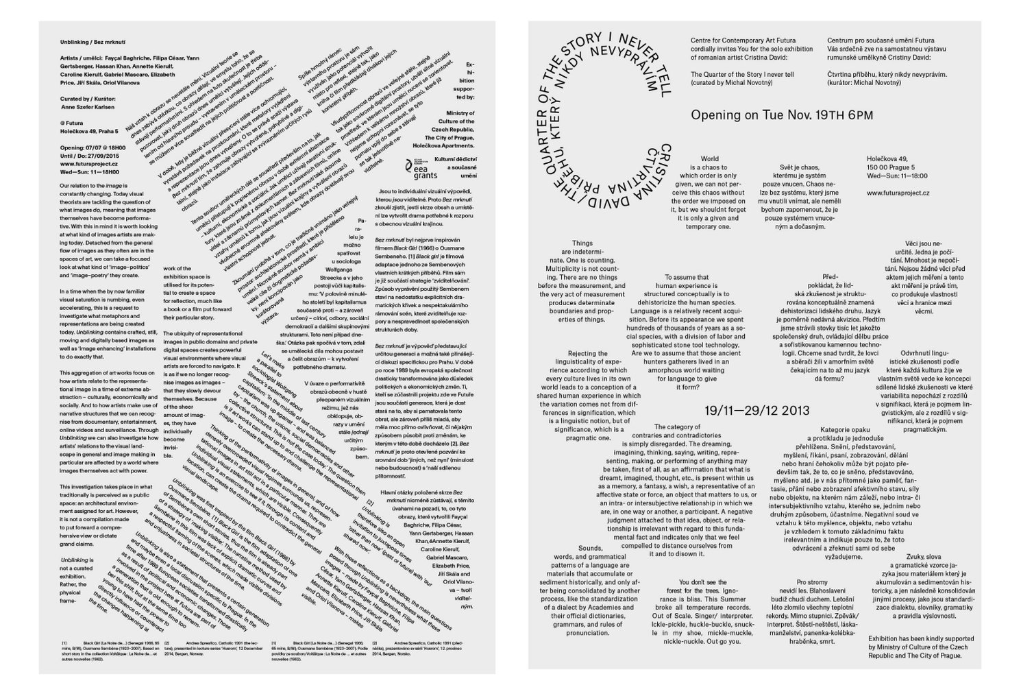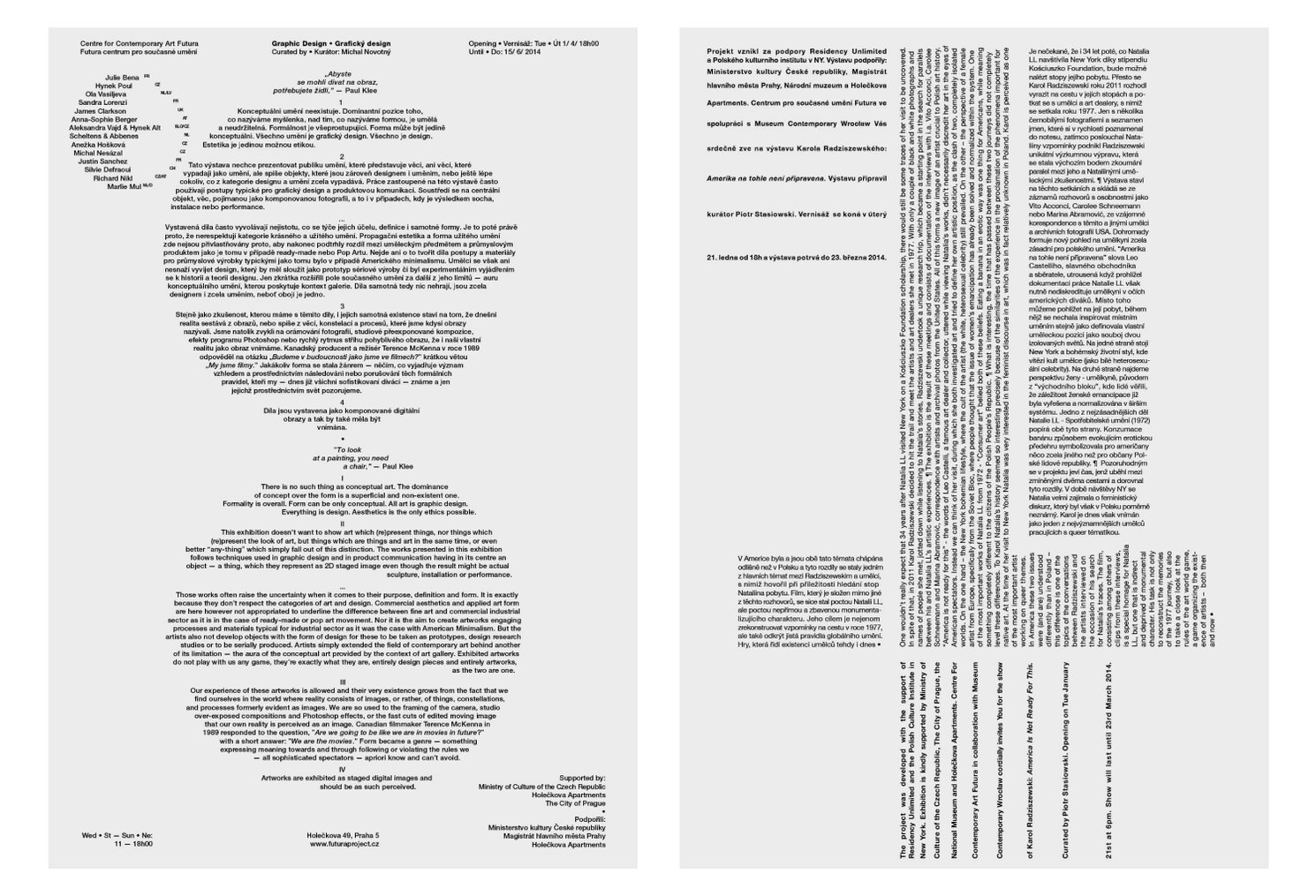 After graduation from the studio of Graphic Design and New Media at UMPRUM, Michal was awarded the TonLab design residency and co-fouded the graphic design studio Parallel Practice. The studio focused on cultural projects, mainly on creating a visual identity for the Centre for Contemporary Art Futura. The project spanned over 6 years (2013–2019), involved more than 60 exhibitions and represented the gallery during an unprecedented stretch of activity under the direction of curator Michal Novotný.